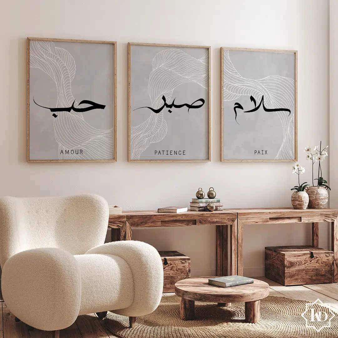 - 35 % de remiseChoix des options Ce produit a plusieurs variations. Les options peuvent être choisies sur la page du produit Vue d'ensembleÀ p. de : 24,99€Le modèle Lignes Grises est un lot de 3 posters (sans cadres) reprenant les calligraphies arabe des mots Amour, Paix et Patience avec une motif de line art abstrait.