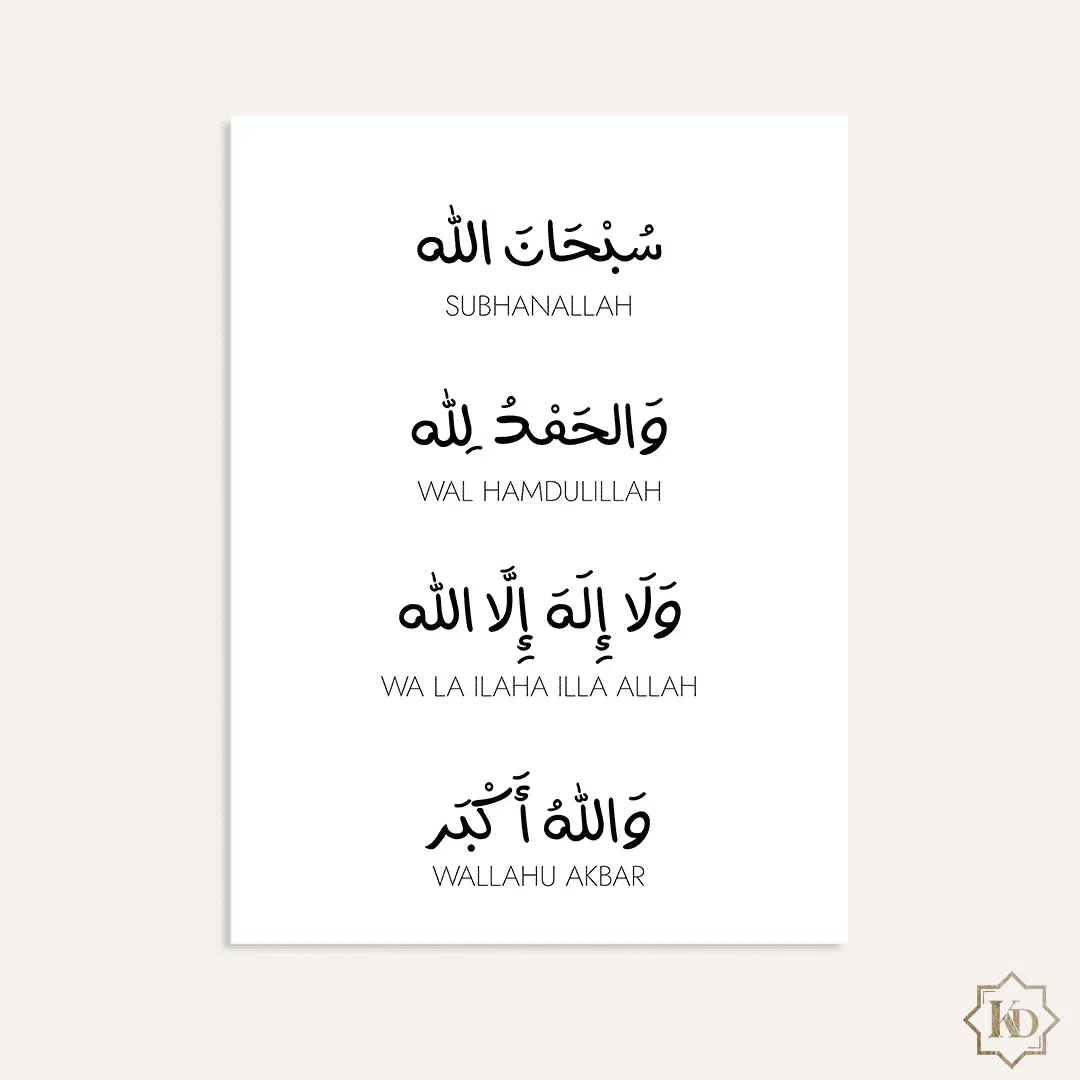 Le modèle Louanges Islam Marbre est un produit de décoration minimaliste et islamique pour la maison. Il reprend 4 formules d’évocation en calligraphie : La ilaha illa Allah, Al Hamdulillah, Subhanallah, Allahu Akbar. Disponible sur plusieurs supports d’impression : poster et poster (support bois).