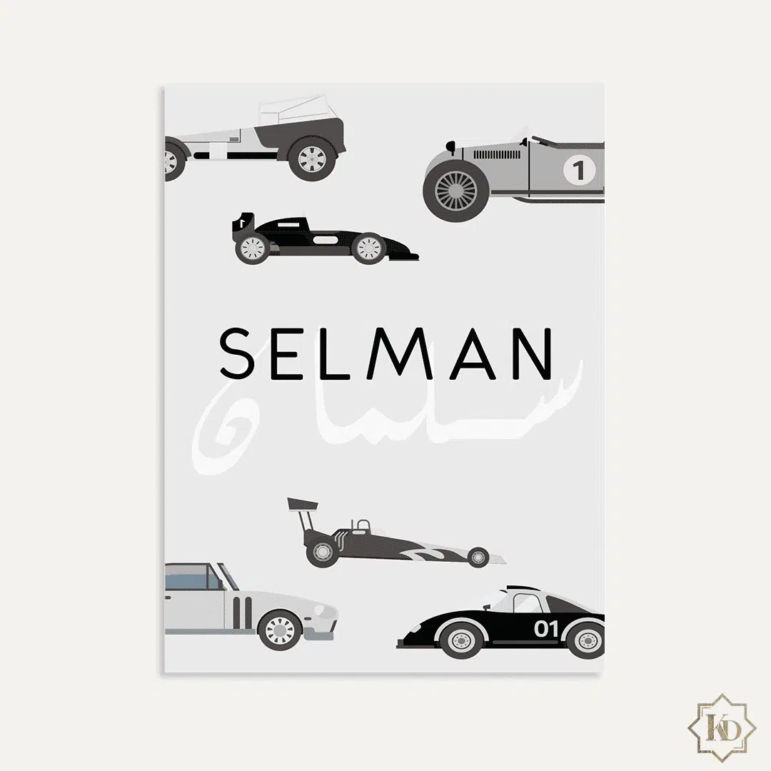 Le modèle Voitures 1 est un produit décoratif pour une chambre de petit garçon ou une salle de jeux. Il reprend un prénom masculin en français et en arabe et des illustrations de voitures. Disponible sur plusieurs supports d’impression : poster, poster (support bois) et toile.