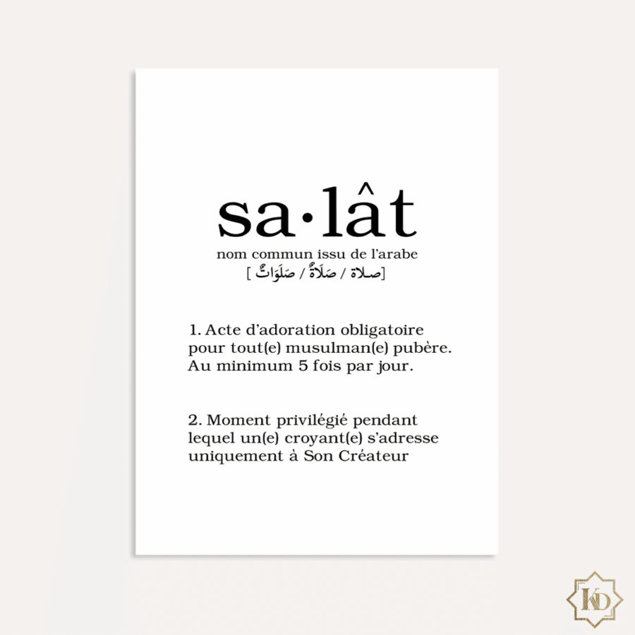 Le modèle Définition de Salat est un produit décoratif pour la maison. Il reprend un terme religieux avec une ou plusieurs définitions à méditer. Disponible sur plusieurs supports d’impression : poster, poster (support bois) et toile.